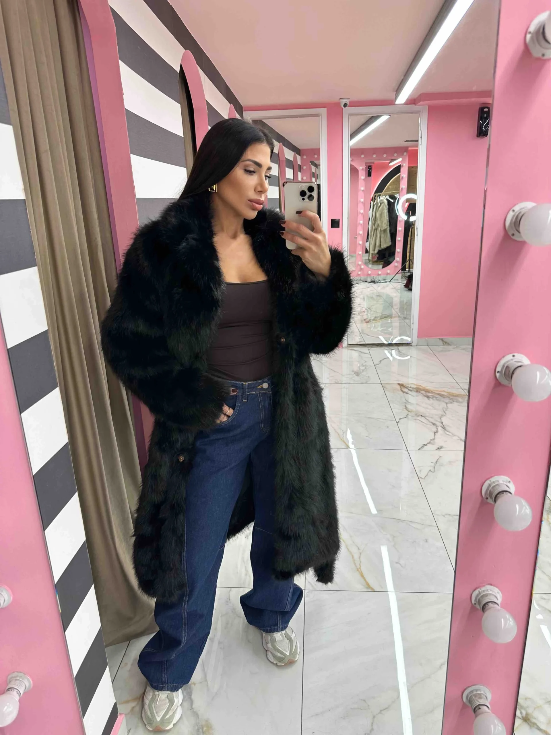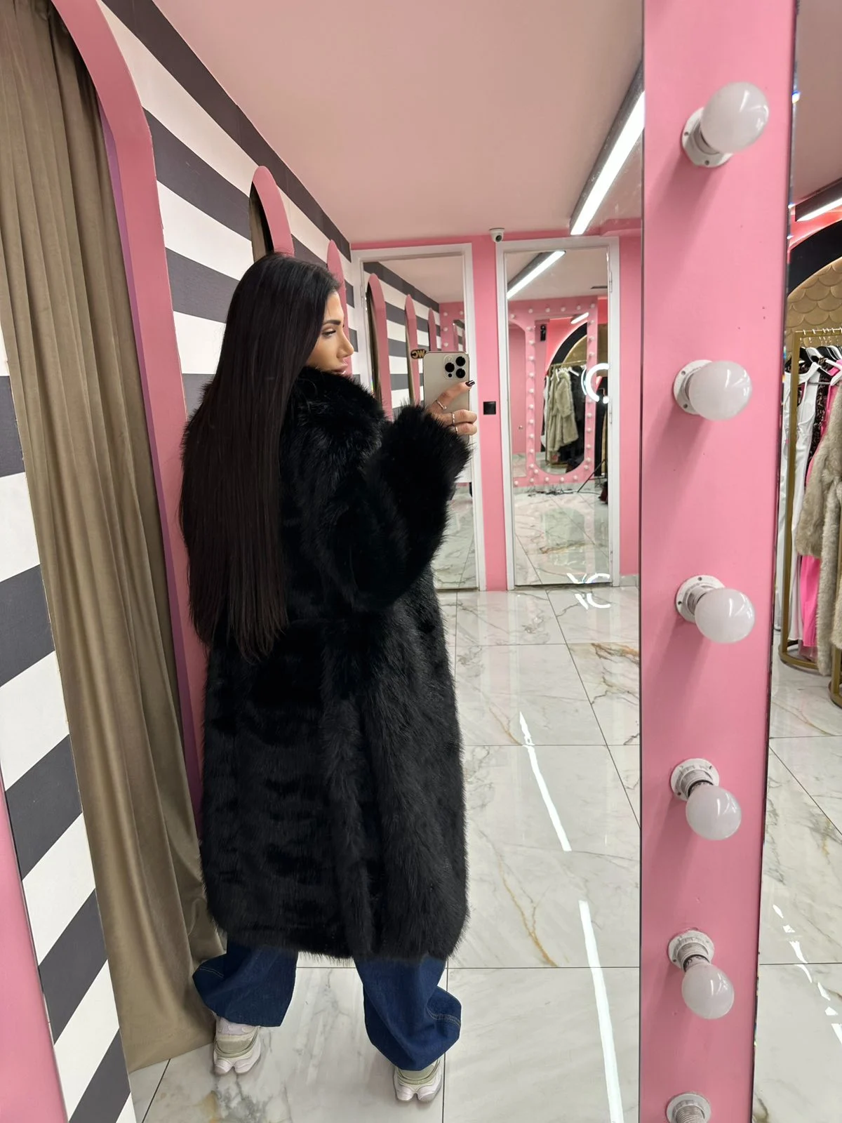 Statement μαύρη οικολογική γούνα με υπέροχη γυαλάδα και εντυπωσιακό όγκο. Κλείνει με κουμπιά και διαθέτει ζώνη για τέλεια εφαρμογή στη μέση. Ιδανική για βραδινές εμφανίσεις με πολυτελές touch.