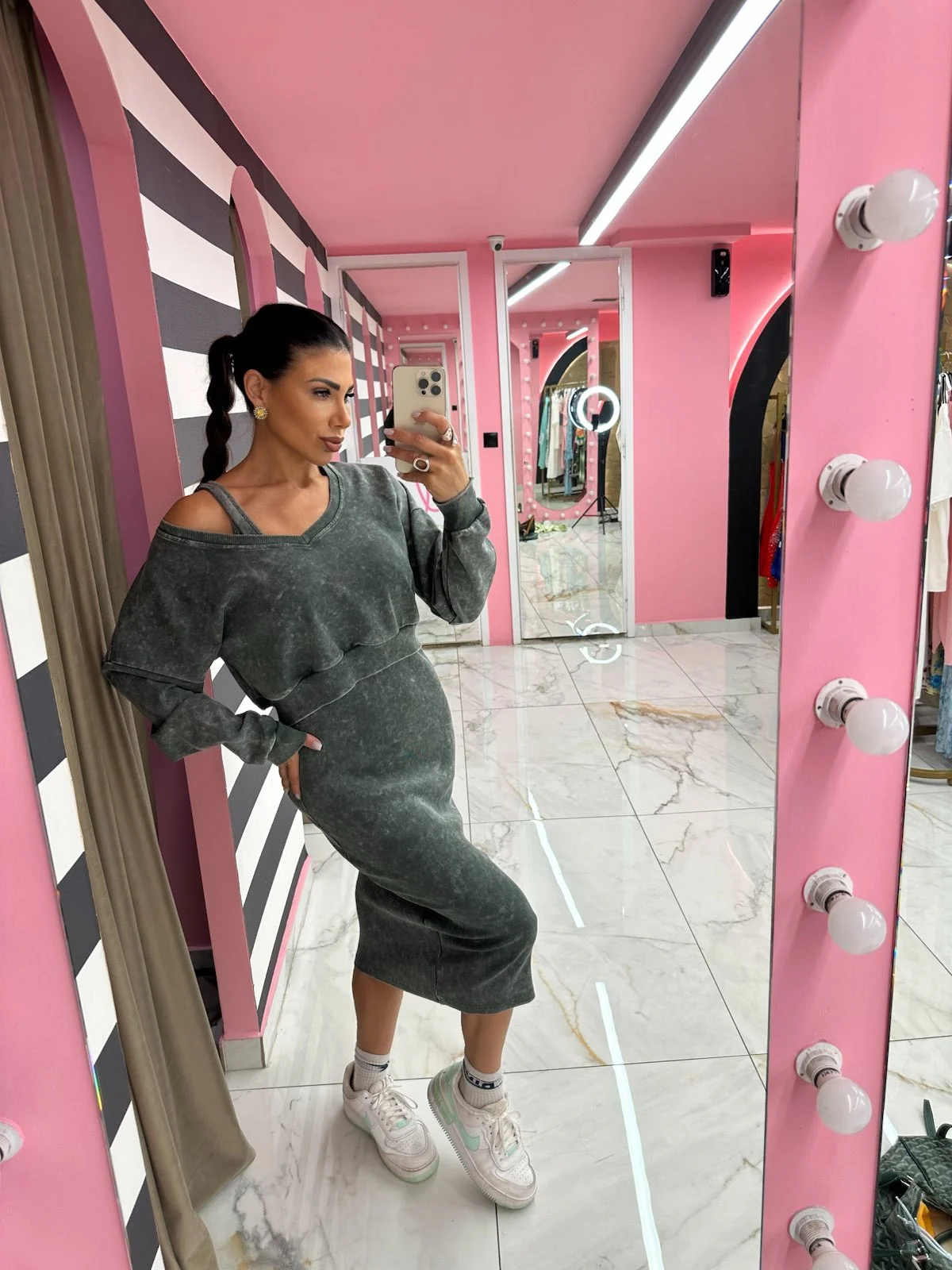 Καθημερινό σετ δύο τεμαχίων με φούτερ και φόρεμα σε χακί-λαδί απόχρωση. Casual look με urban χαρακτήρα.