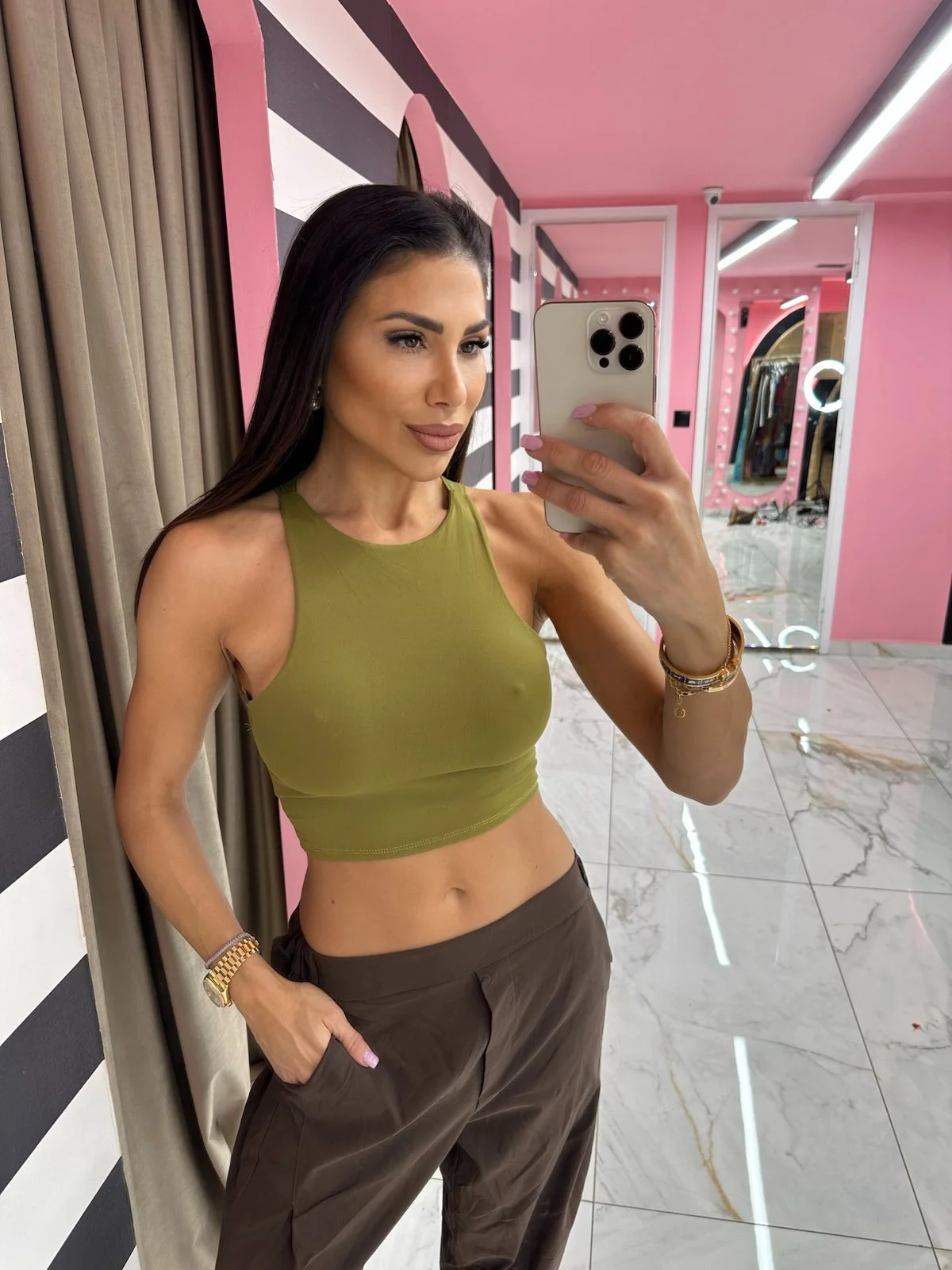 Crop top σε λαδί απόχρωση, minimal και κομψό με στενή εφαρμογή. Το τέλειο basic για καθημερινό στυλ αλλά και για πιο σπορ εμφανίσεις.