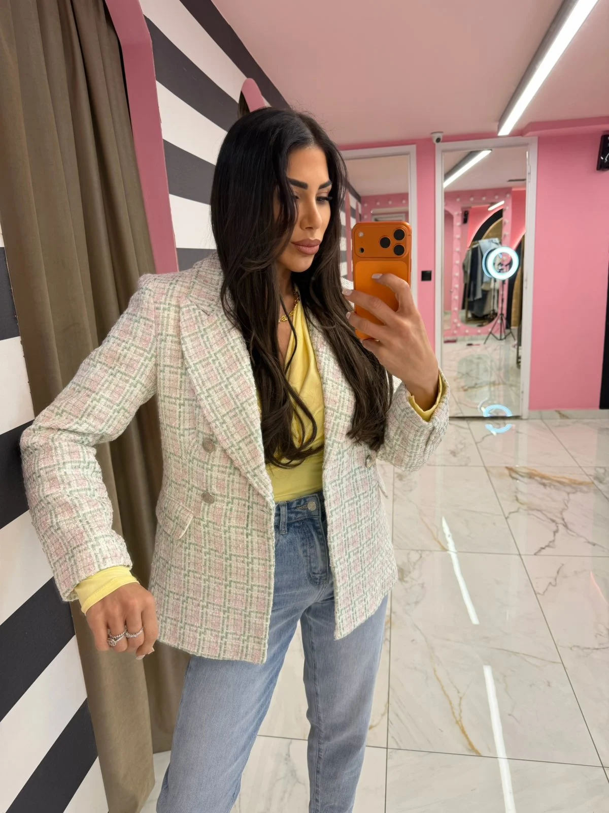 Κομψό σακάκι σε tweed ύφασμα με απαλούς pastel τόνους που αποπνέουν φρεσκάδα και θηλυκότητα. Διαθέτει κλασικό πέτο, κουμπιά μπροστά και άνετη γραμμή που κολακεύει το σώμα. Ιδανικό για chic καθημερινές εμφανίσεις αλλά και πιο προσεγμένα looks, φοριέται εύκολα με τζιν, παντελόνια ή ακόμα και φορέματα.