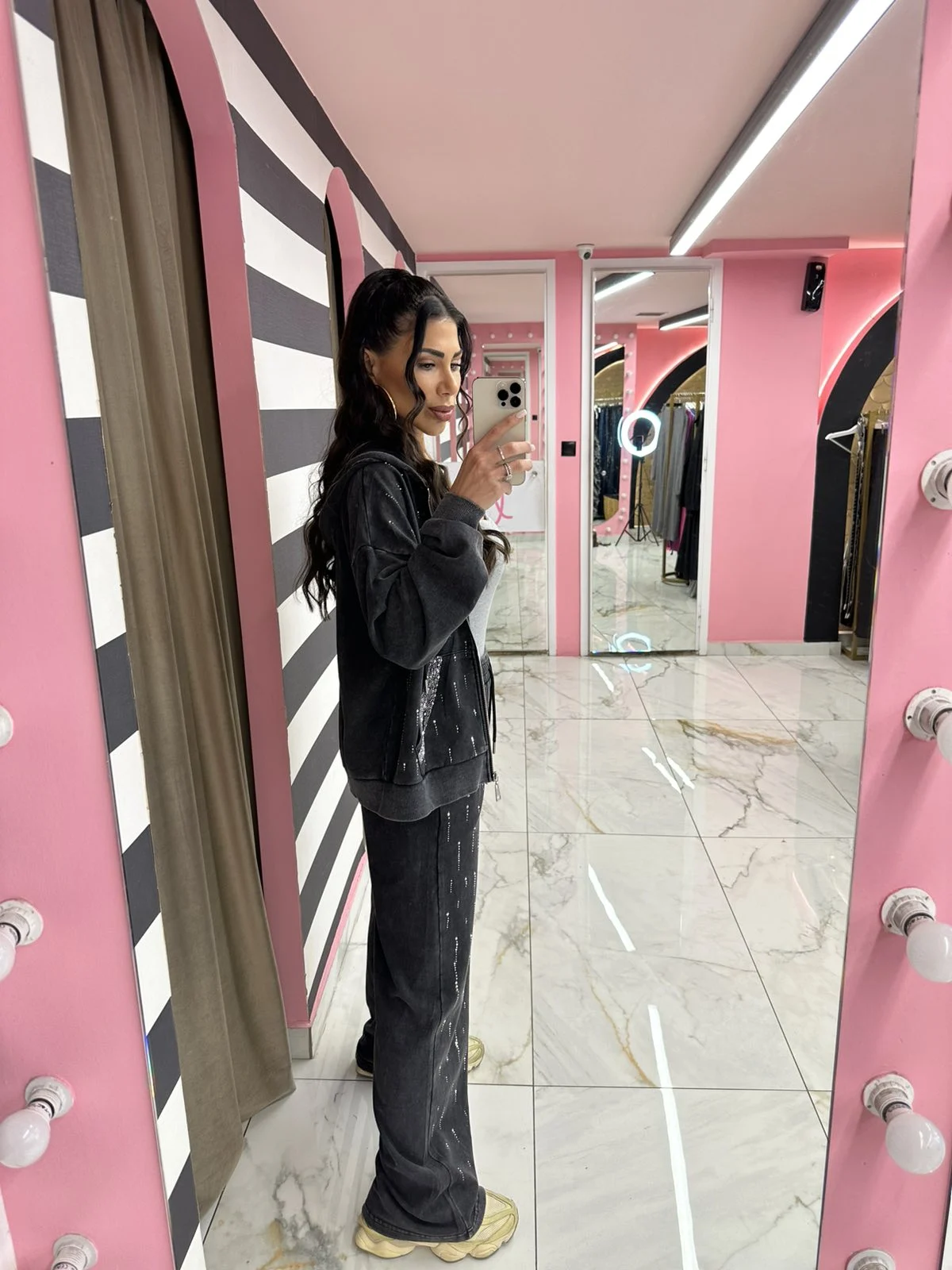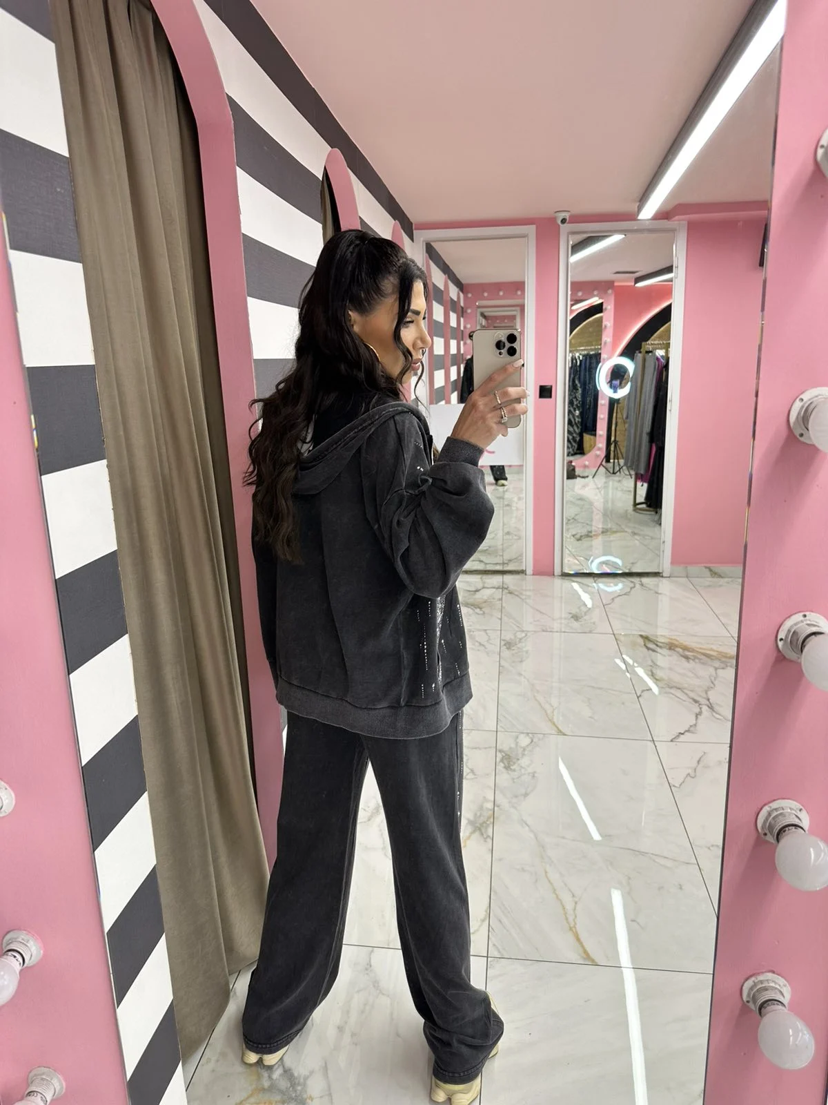 Εντυπωσιακή πετροπλυμένη φόρμα σε σετ, με καταπληκτική ποιότητα και άνετη εφαρμογή. Αποτελείται από ζακέτα με φερμουάρ και κουκούλα, καθώς και παντελόνι με λάστιχο στη μέση. Οι διακριτικές strass λεπτομέρειες χαρίζουν glam πινελιά, ενώ παραμένει απόλυτα καθημερινή και ευκολοφόρετη. Μαλακό ύφασμα, άψογη ραφή και πολύ ωραία πτώση.