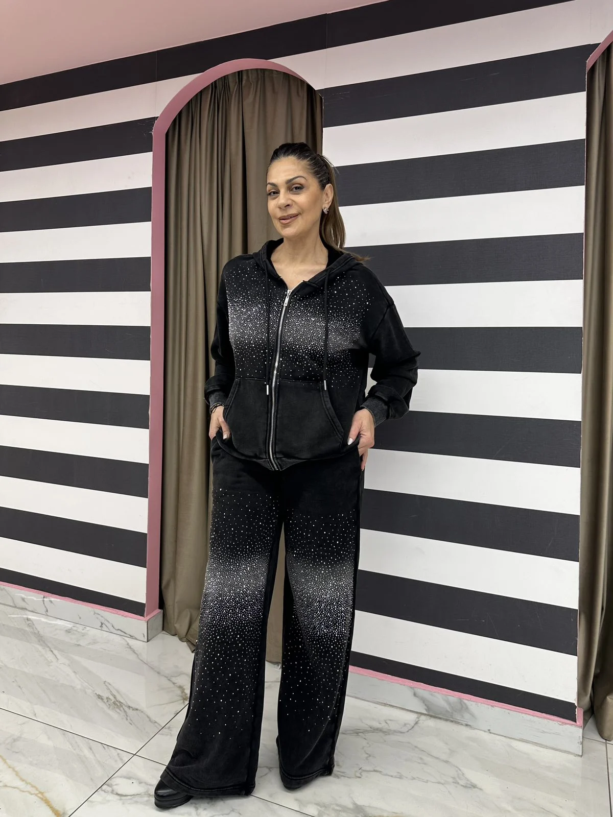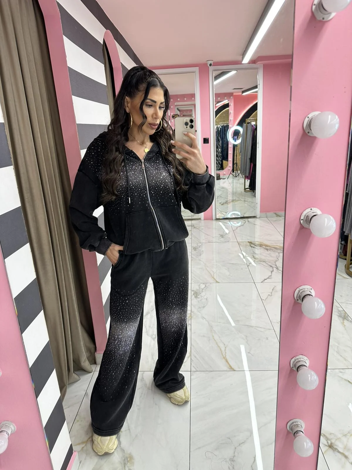 Εντυπωσιακή πετροπλυμένη φόρμα σε σετ, με καταπληκτική ποιότητα και άνετη εφαρμογή. Αποτελείται από ζακέτα με φερμουάρ και κουκούλα, καθώς και παντελόνι με λάστιχο στη μέση. Οι διακριτικές strass λεπτομέρειες προσθέτουν glam χαρακτήρα, χωρίς να χάνει τον casual ρόλο της. Μαλακό ύφασμα, άψογη ραφή και πολύ ωραία πτώση.