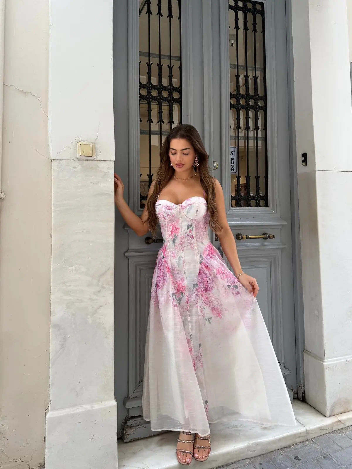 Ρομαντικό midi φόρεμα με εντυπωσιακό floral σχέδιο σε ροζ αποχρώσεις που χαρίζει μία φίνα και πολύ θηλυκή αισθητική. Το εφαρμοστό μπούστο με cups αγκαλιάζει το σώμα και αναδεικνύει τη σιλουέτα, ενώ η αέρινη φούστα δημιουργεί κομψή κίνηση σε κάθε βήμα. Οι λεπτές τιράντες και το ελαφρώς σφηκοφωλιασμένο πίσω μέρος προσφέρουν άνεση και τέλεια εφαρμογή. Ιδανικό για καλοκαιρινές εξόδους, events ή ρομαντικές εμφανίσεις.