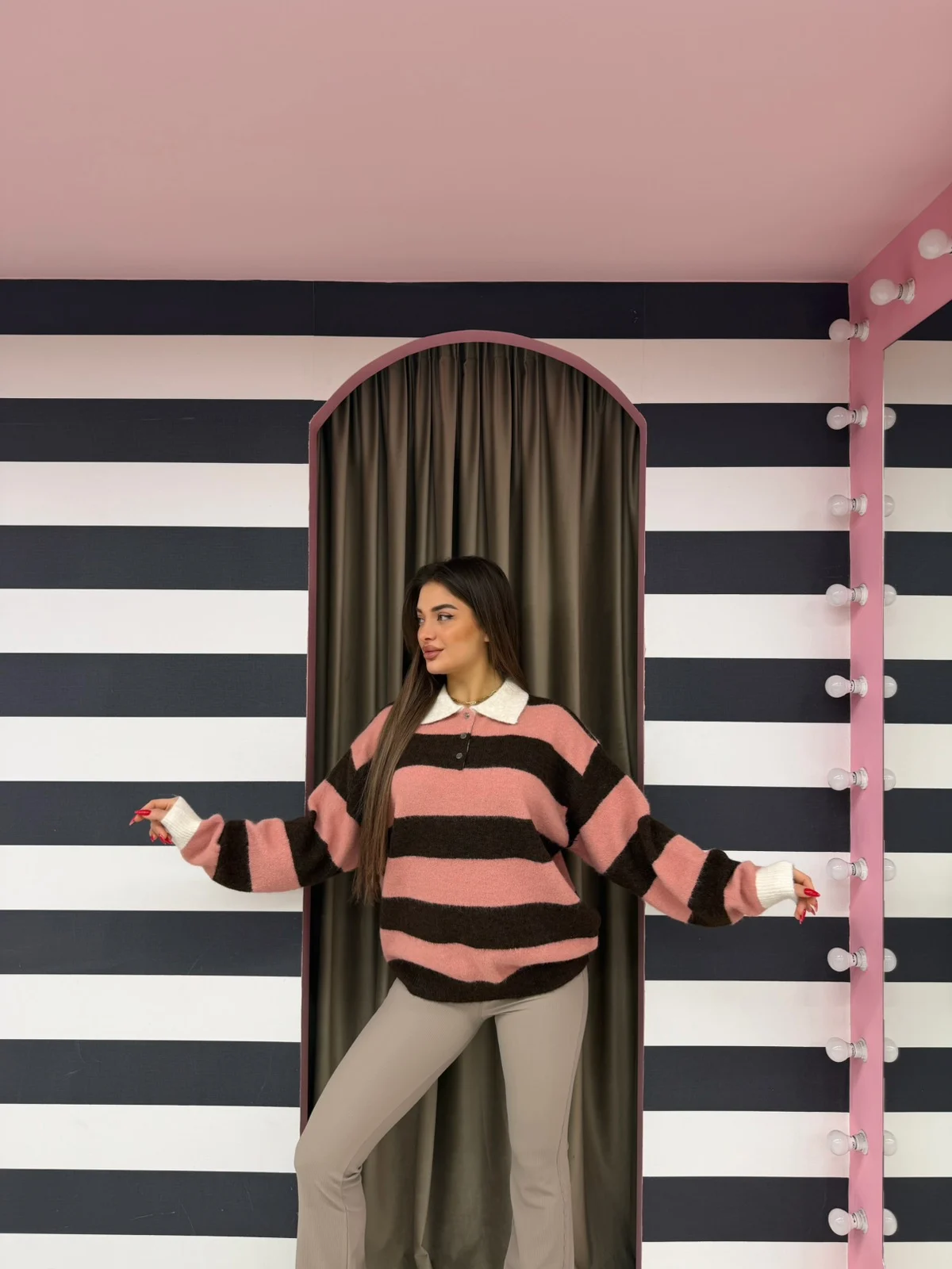 Απαλό πουλόβερ με φαρδιές ροζ και καφέ ρίγες, λευκό γιακά και κουμπάκια στο ντεκολτέ. Ιδανικό για girly fall outfits με άνετη γραμμή που ταιριάζει σε όλες. One size.