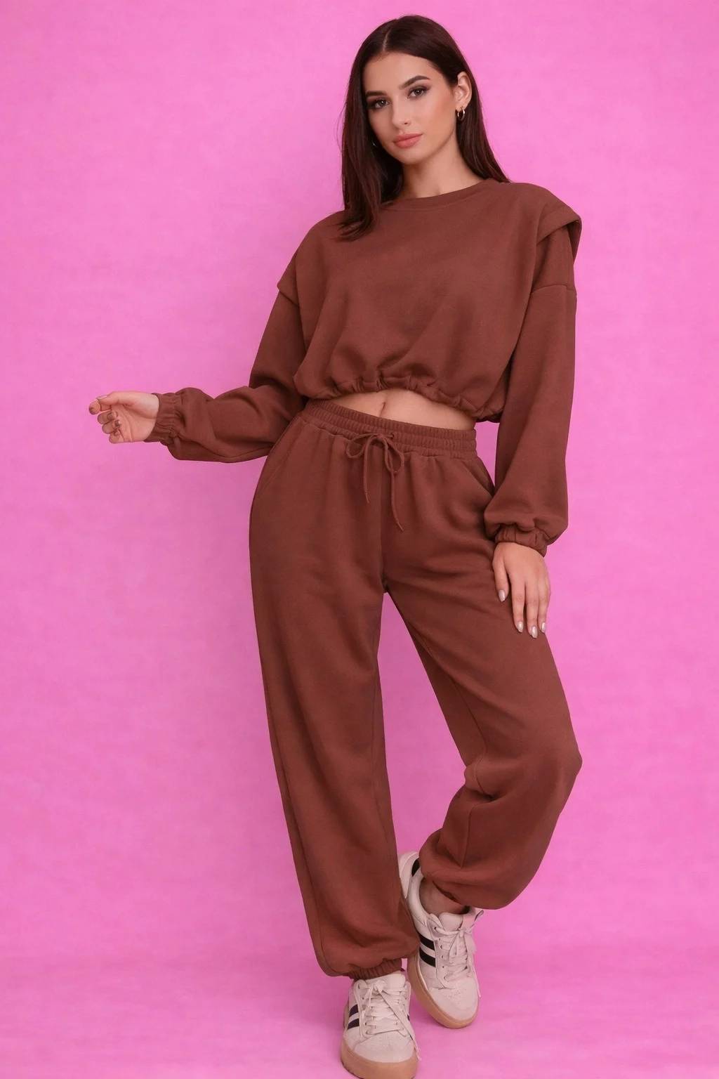 Αποτελείται από cropped φούτερ με λάστιχο στη μέση και παντελόνι με ελαστική μέση και κορδόνι για τέλεια εφαρμογή.