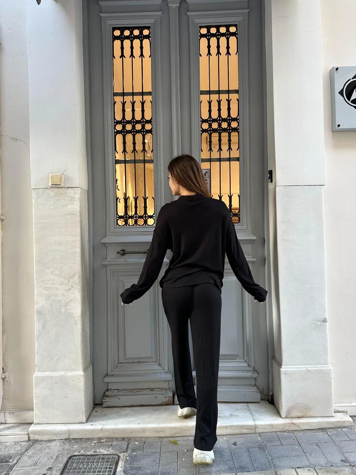 Minimal μαύρο ribbed σετ σε χαλαρή γραμμή. Εξαιρετικά μαλακό ύφασμα, ελαστικό και άνετο, με wide-leg παντελόνι που κολακεύει κάθε σιλουέτα. Τέλειο για all-day outfits.