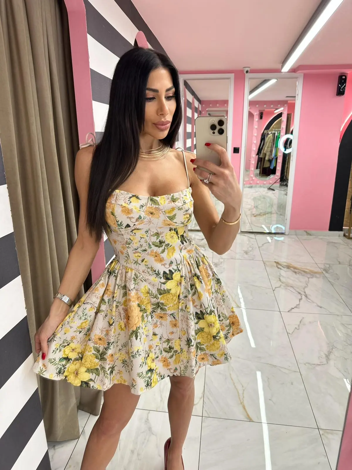 Φρέσκο και καλοκαιρινό mini φόρεμα με floral σχέδιο σε κίτρινες αποχρώσεις που φωτίζει την εμφάνιση. Το structured μπούστο αγκαλιάζει το σώμα ενώ η φούστα ανοίγει χαρίζοντας κίνηση και στυλ. Ένα κομμάτι ιδανικό για καθημερινές αλλά και πιο εντυπωσιακές εμφανίσεις.
