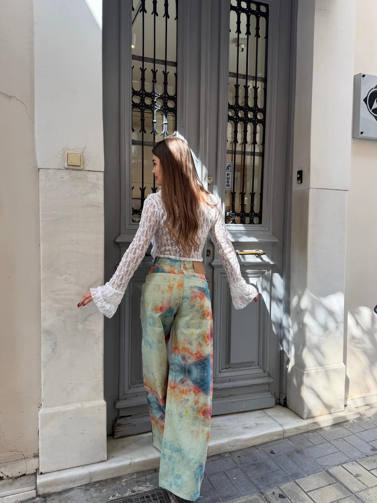 Εντυπωσιακή palazzo παντελόνα με μοναδικό tie-dye print σε αποχρώσεις μπλε, κοραλί και πράσινου που θυμίζουν καλοκαιρινό ηλιοβασίλεμα ✨