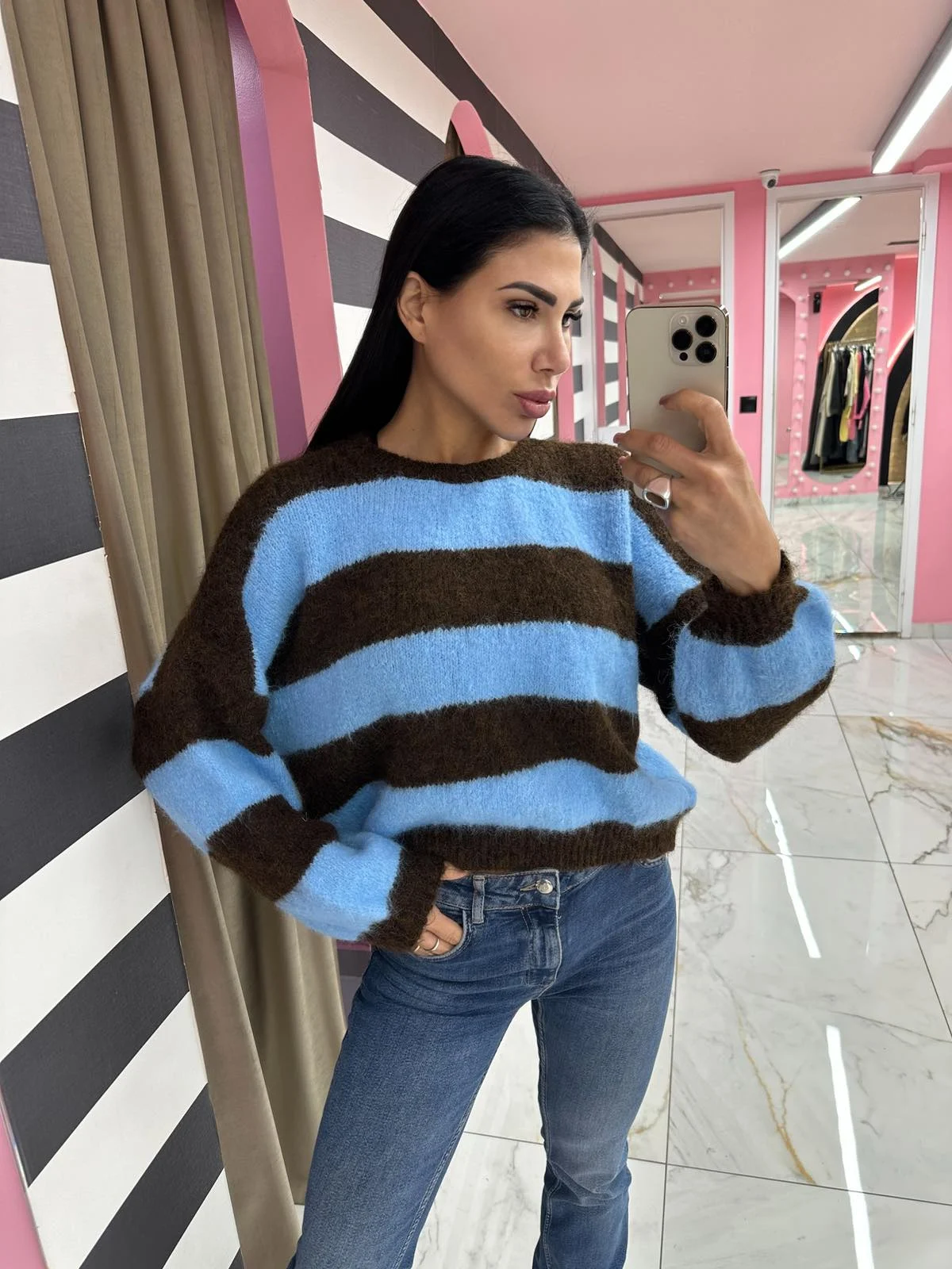 Απαλή και αφράτη πλεκτή μπλούζα με γαλάζιες και καφέ ρίγες. Cozy αλλά και stylish, συνδυάζεται υπέροχα με τζιν για ένα φωτεινό, χειμωνιάτικο look.