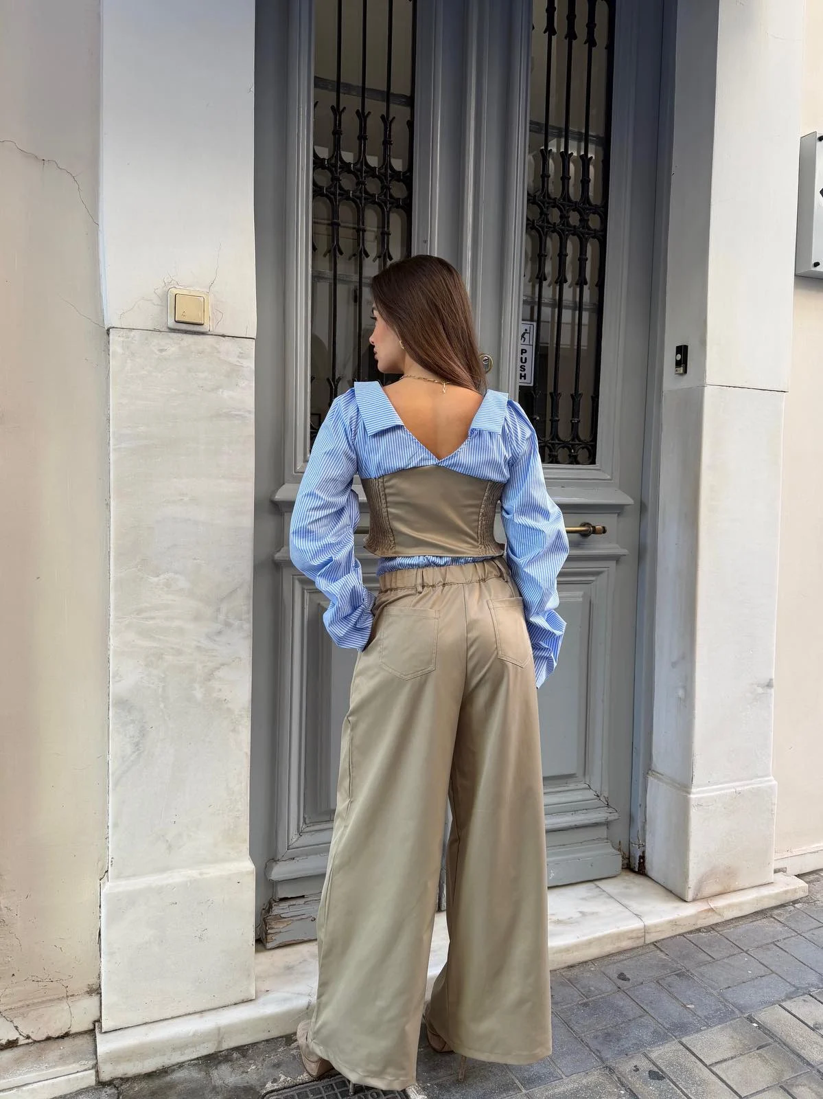 Κομψό και σύγχρονο σετ με ριγέ πουκάμισο και cropped top που αγκαλιάζει το σώμα, δημιουργώντας θηλυκή σιλουέτα. Το ψηλόμεσο παντελόνι σε φαρδιά γραμμή προσφέρει άνεση και στιλ, ενώ ο συνδυασμός μπεζ αποχρώσεων δίνει διαχρονική κομψότητα. Φοριέται εύκολα από το πρωί μέχρι το βράδυ και απογειώνεται με heels ή sneakers.