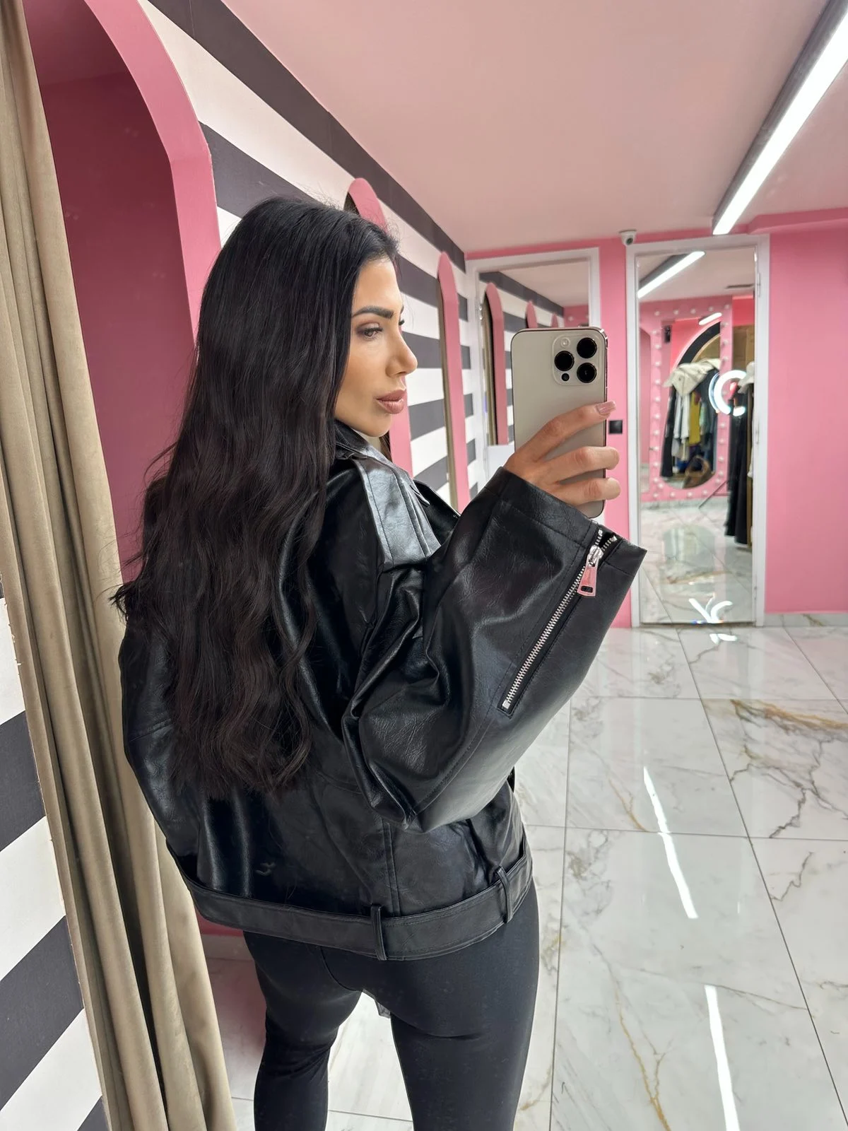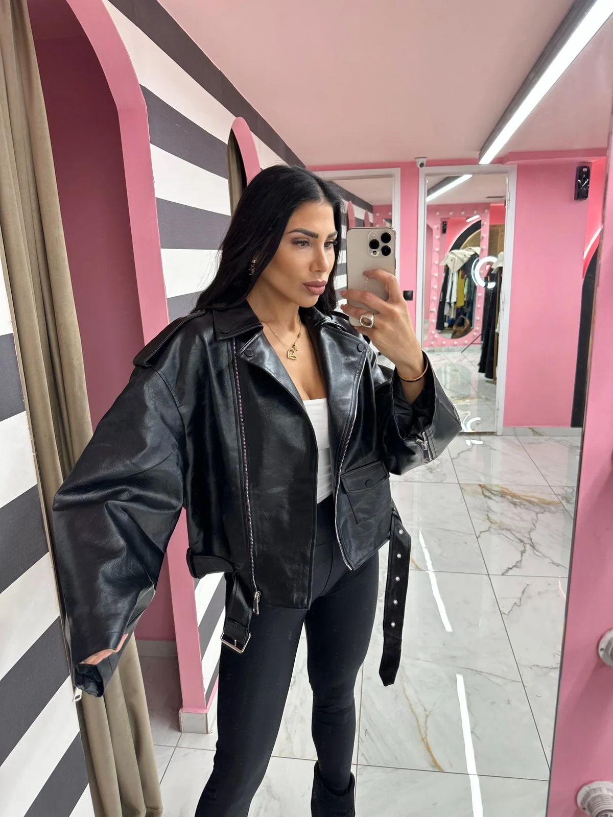 Το Urban Leather Jacket είναι το απόλυτο oversized biker jacket που απογειώνει κάθε look. Με μαλακή δερματίνη υψηλής ποιότητας, φαρδιά μανίκια, μεταλλικές λεπτομέρειες και ζώνη στο τελείωμα, δίνει rock-chic ύφος και ταιριάζει με τα πάντα – από κολάν και crop tops μέχρι φούστες και τζιν.