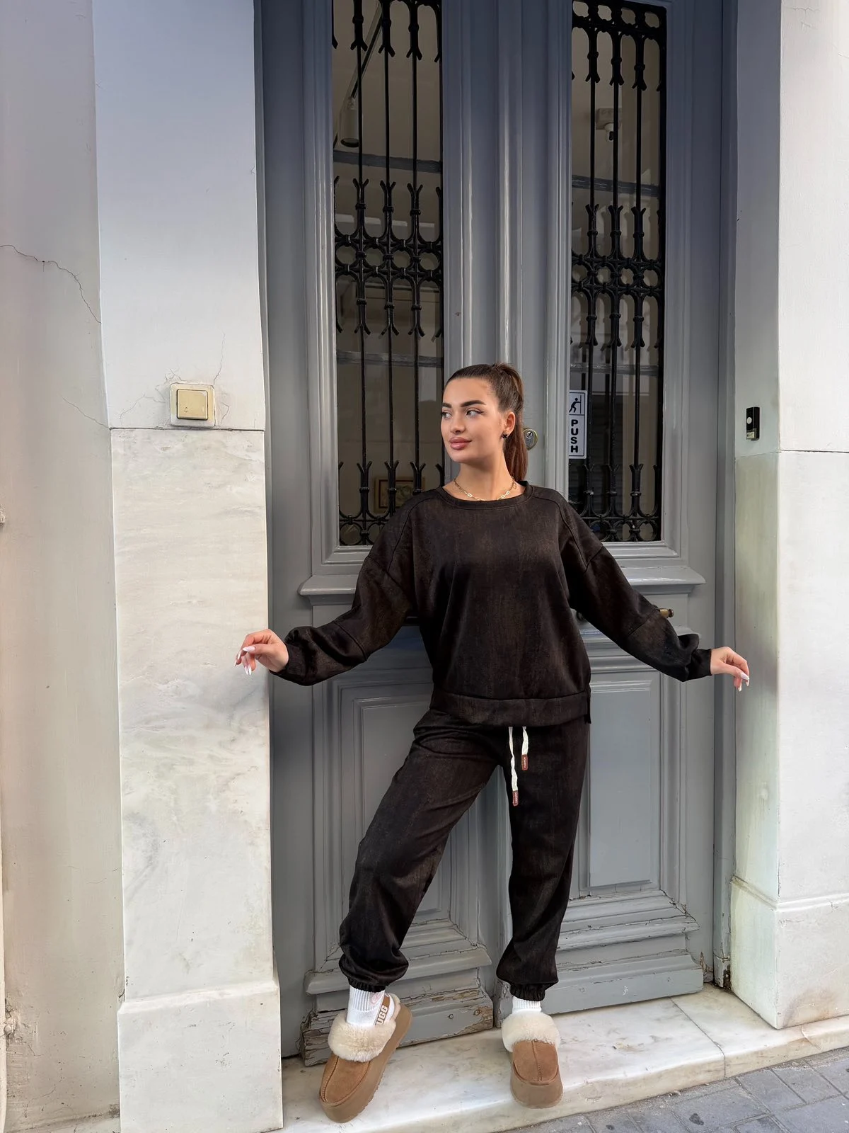 Minimal και διαχρονικό velour σετ που δεν πρέπει να λείπει από καμία γκαρνταρόμπα. Εξαιρετικά μαλακό ύφασμα, άνετη εφαρμογή και chic αποτέλεσμα. Ιδανικό για all-day looks με sneakers ή boots.
