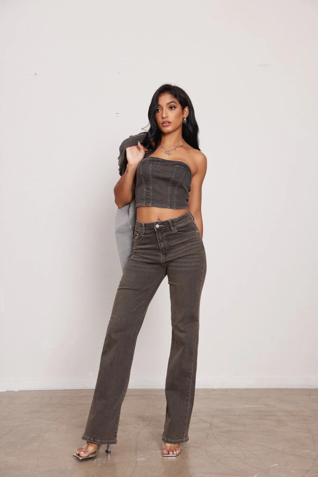 Denim σετ σε washed καφέ απόχρωση, με strapless τοπ και παντελόνι σε ίσια γραμμή. Το ιδιαίτερο χρώμα του χαρίζει vintage αισθητική και ξεχωριστό χαρακτήρα. Ένα statement σύνολο που φοριέται από το πρωί έως το βράδυ.