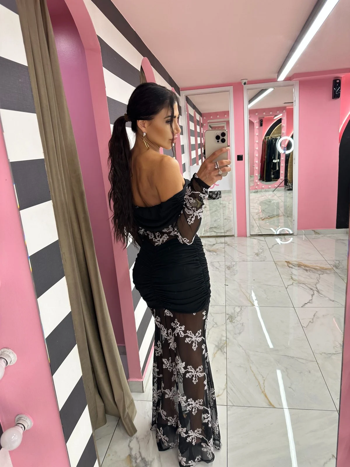 Μαύρη βάση με λευκή δαντέλα που δημιουργεί μοναδική αντίθεση και elegant χαρακτήρα. Off-shoulder σχεδιασμός, διάφανη φούστα με floral μοτίβα και εφαρμοστή γραμμή που κολακεύει τη σιλουέτα.