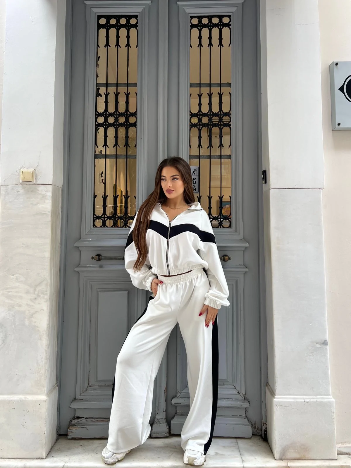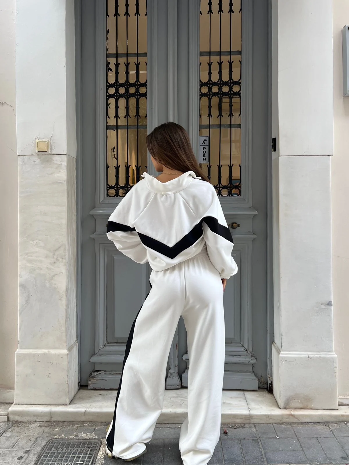 Λευκό σετ φόρμας με μαύρες λεπτομέρειες. Minimal, φωτεινό και stylish — ιδανικό για comfy look που ξεχωρίζει.
