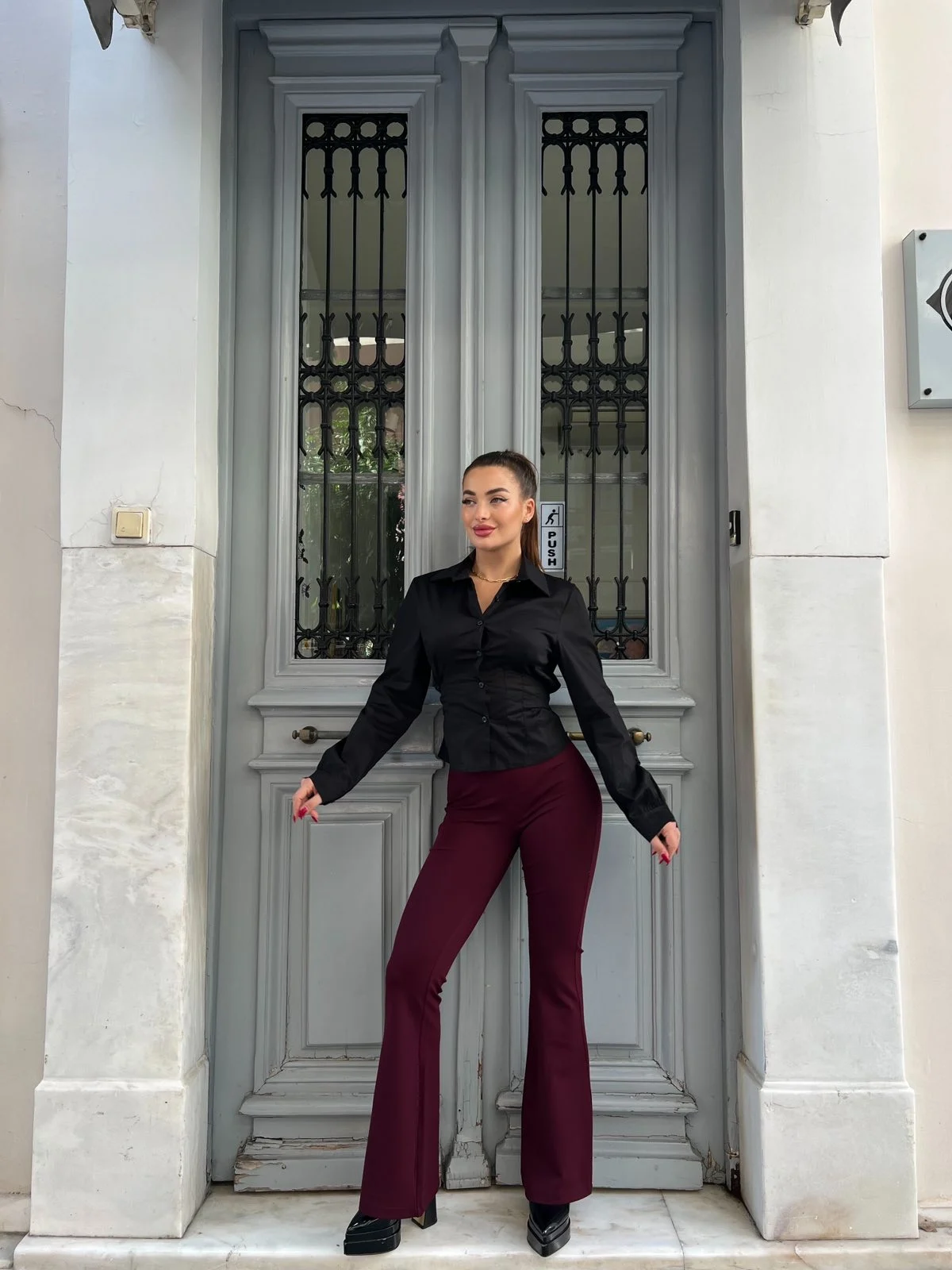 Παντελόνι σε πλούσια απόχρωση μπορντό που αποπνέει δυναμισμό και φινέτσα. Το flare κόψιμο του χαρίζει κομψή γραμμή και προσθέτει ύψος, ενώ το ελαστικό ύφασμα προσφέρει τέλεια εφαρμογή και άνεση όλη μέρα.
