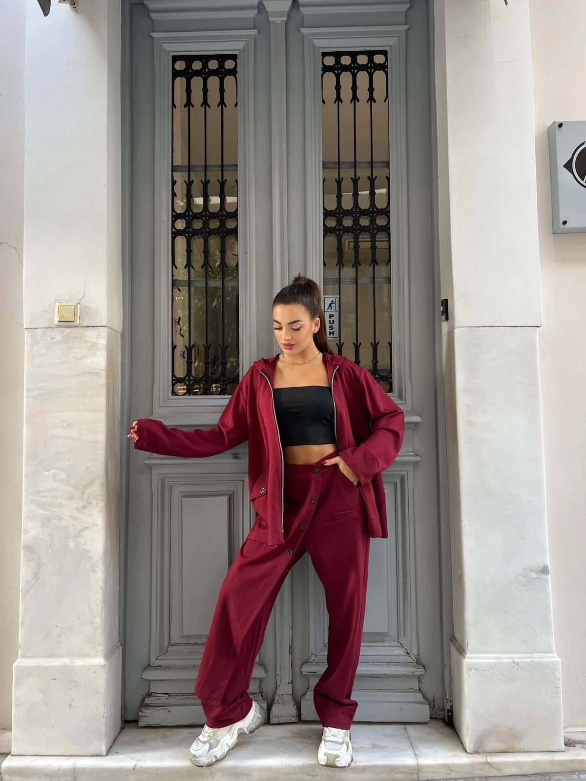 Μπορντό σετ με hoodie και φαρδύ παντελόνι που αποπνέει στυλ και αυτοπεποίθηση. Minimal αλλά statement, ιδανικό για cozy μέρες με fashionable διάθεση.