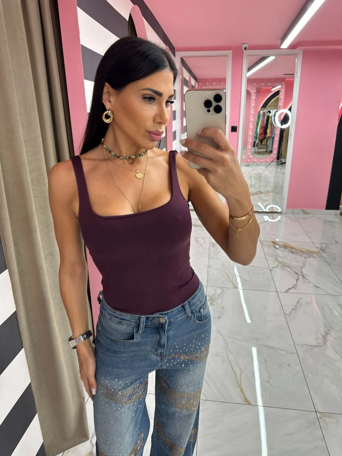 Μπορντό top με θηλυκή διάθεση και εφαρμογή που αγκαλιάζει το σώμα. Διαθέτει λάστιχο στο στήθος για σταθερό κράτημα.