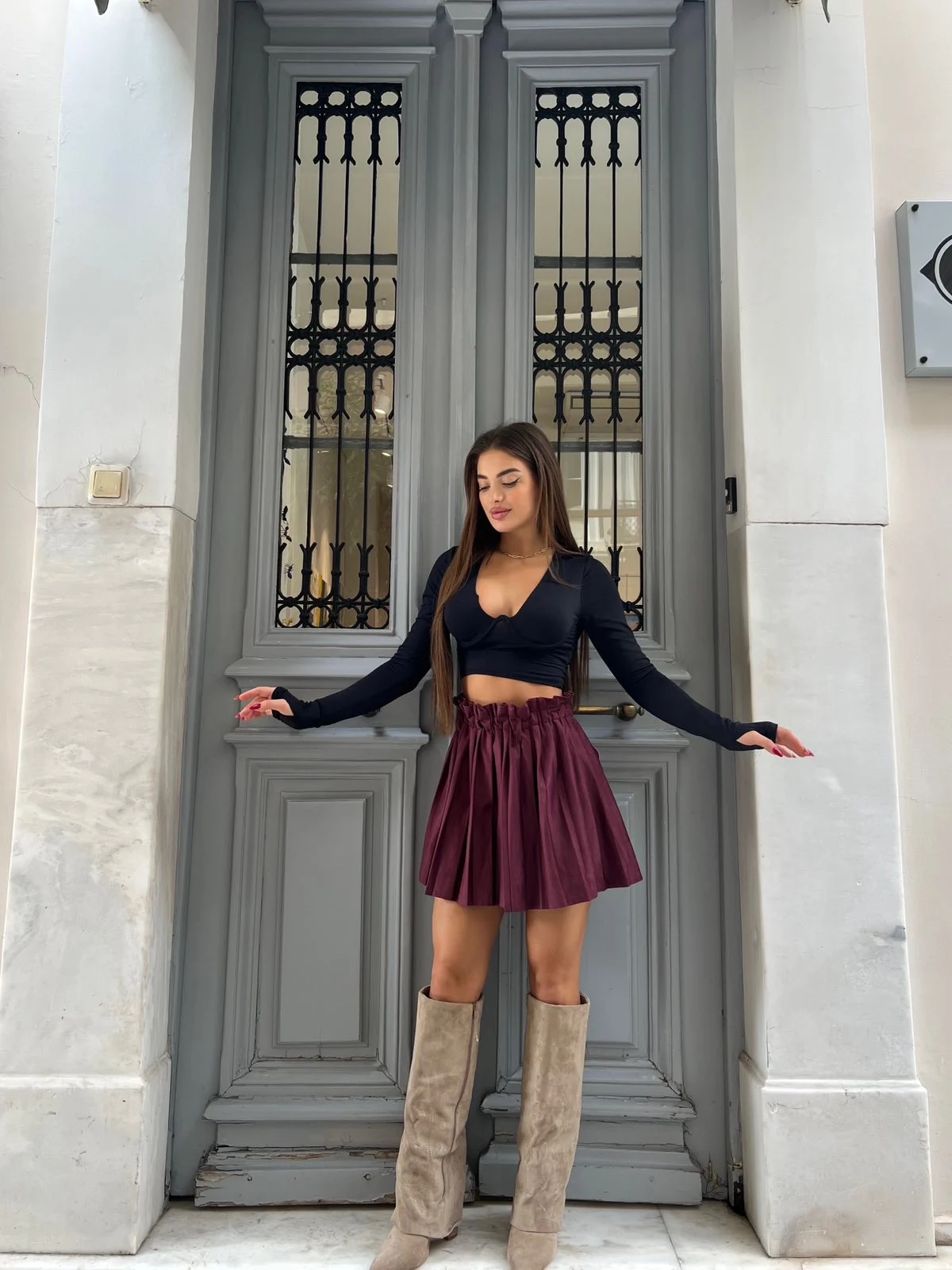 Statement κομμάτι σε βαθύ μπορντό, με glossy υφή και girly κίνηση. Ελαστική μέση που εφαρμόζει άνετα και θηλυκή γραμμή που αναδεικνύει τη σιλουέτα. Ιδανική για βραδινές ή γιορτινές εμφανίσεις.