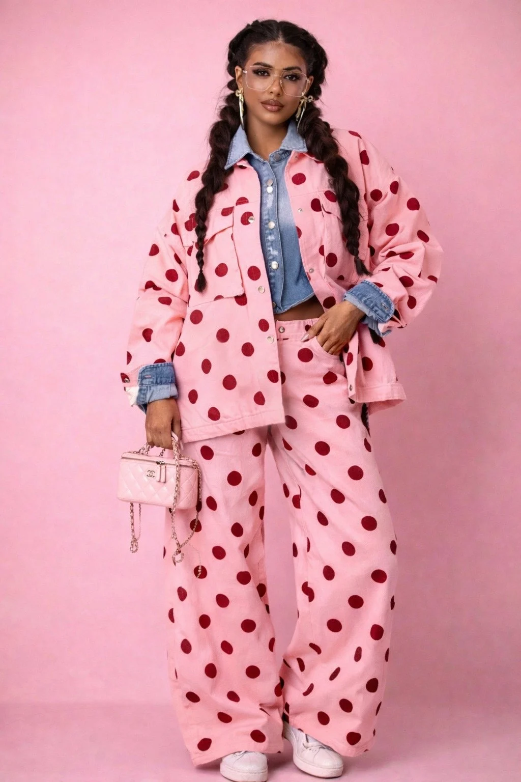 Statement jacket σε ροζ βάση με έντονα κόκκινα πουά για ultra girly & fashion-forward εμφανίσεις 💖