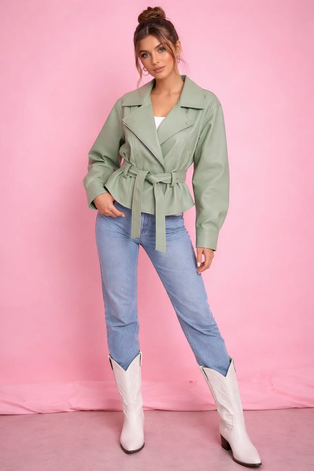 Statement jacket σε μοντέρνα φιστικί απόχρωση για ξεχωριστές εμφανίσεις. Μαλακή υφή, σταυρωτό κλείσιμο και ζωνάκι που αγκαλιάζει τη μέση, αναδεικνύοντας τη σιλουέτα. Το ιδανικό πανωφόρι για να απογειώσεις ακόμη και το πιο απλό καθημερινό look.