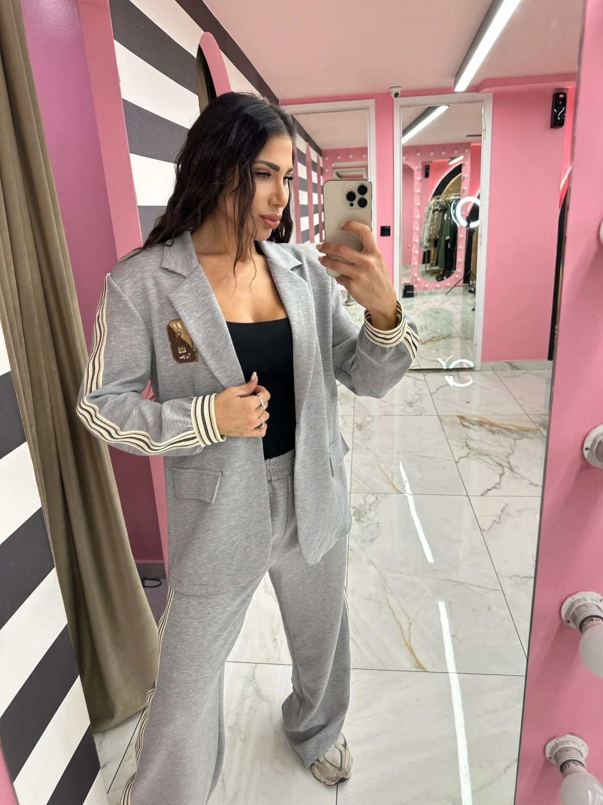 Chic σετ σε ανοιχτό γκρι, ιδανικό για urban εμφανίσεις με άποψη. Ελαστικό ύφασμα τύπου φόρμας και άνετη γραμμή που “αγκαλιάζει” το σώμα χωρίς να πιέζει. Καλύπτει έως XL.