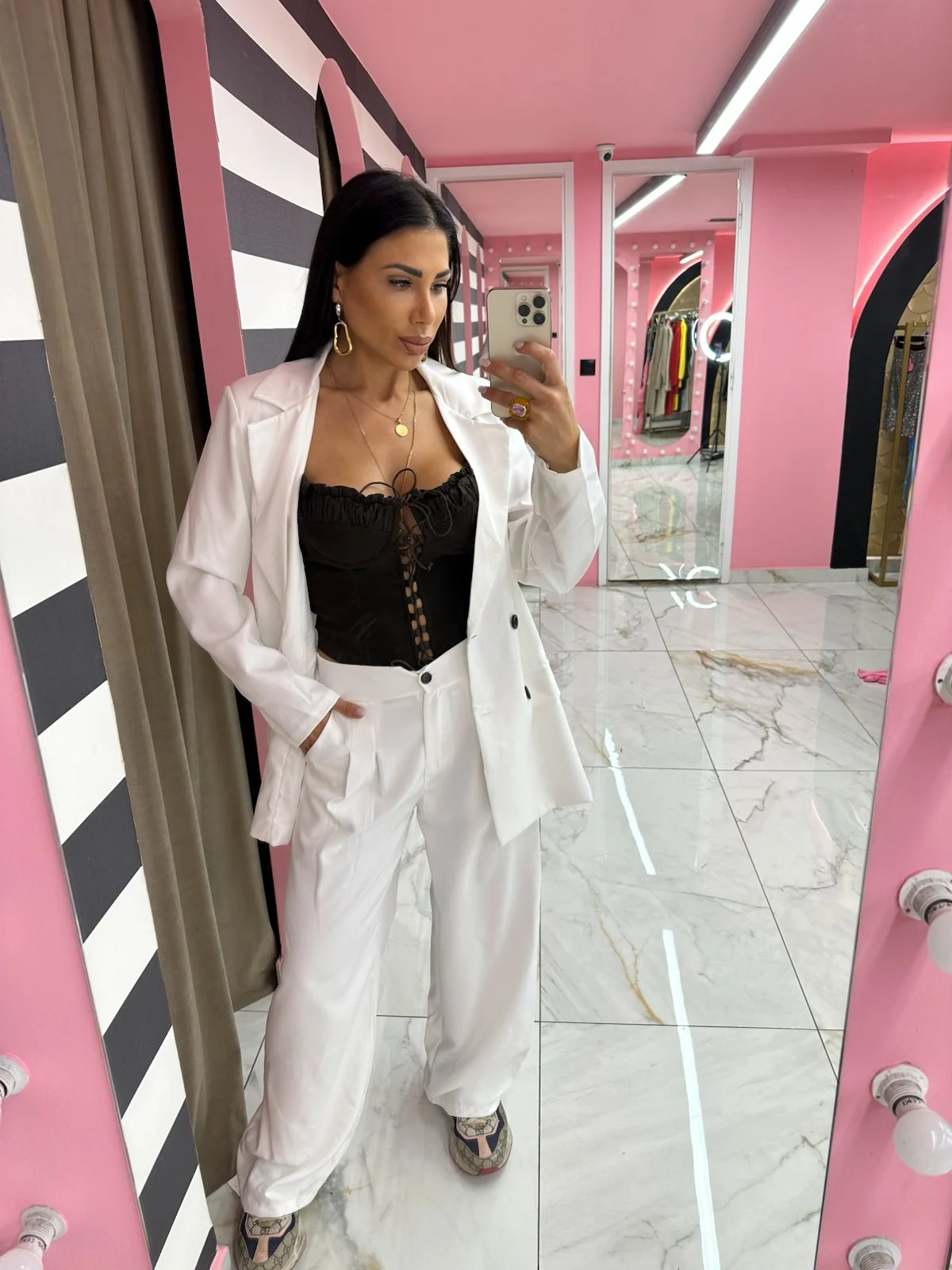 Minimal και chic, το λευκό σετ με σακάκι και παντελόνι είναι το απόλυτο κομμάτι για all day εμφανίσεις. Συνδυάζει άνεση και στυλ, ενώ καλύπτει έως large χάρη στη relaxed γραμμή του.